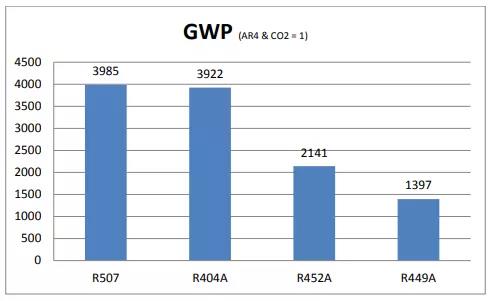R452A制冷剂GWP值比R404a和R507低45%,与R404a、R507排气温度相近,与R404a、R507的质量流量相同,替换时无需调节热力膨胀阀,与现有设备和冷冻油兼容,R404a、R507泄露后可直接加注R452A。